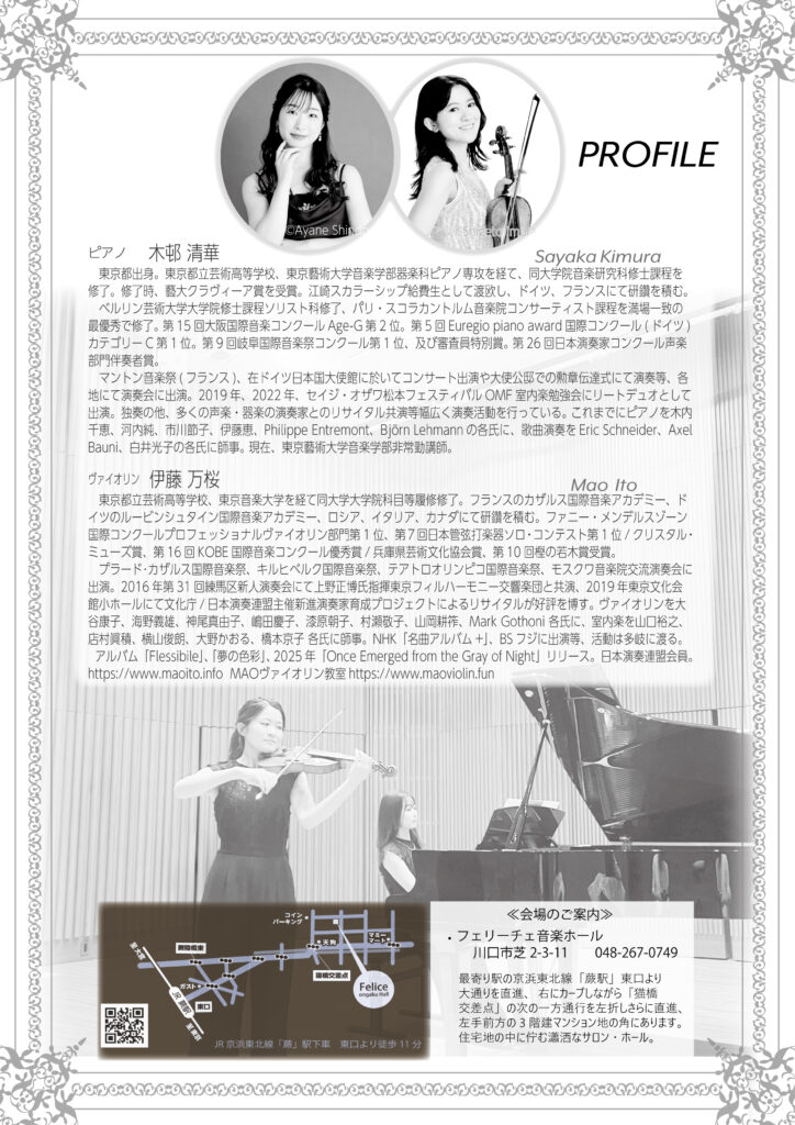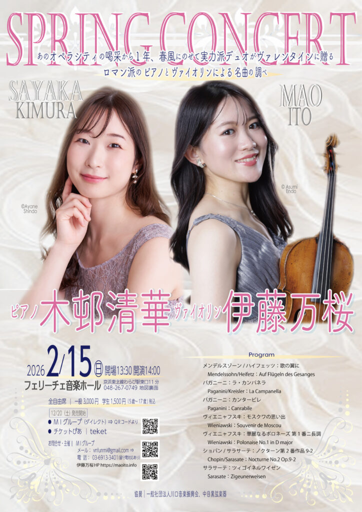 【12/10~発売】2026/2/15㊐14:00 木邨清華pf伊藤万桜vn Spring Concert フェリーチェ音楽ホール
