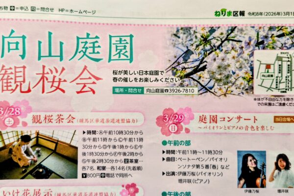 満開の桜に向かって、演奏者も気持ちよく弾かせていただける向山庭園(こうやまていえん)。練馬区の奥座敷と言われるほど手入れの行き届いた庭園は夜にはライトアップもされます。傾斜地を上手に利用した庭園には池や茶室もあり、アゴラ…