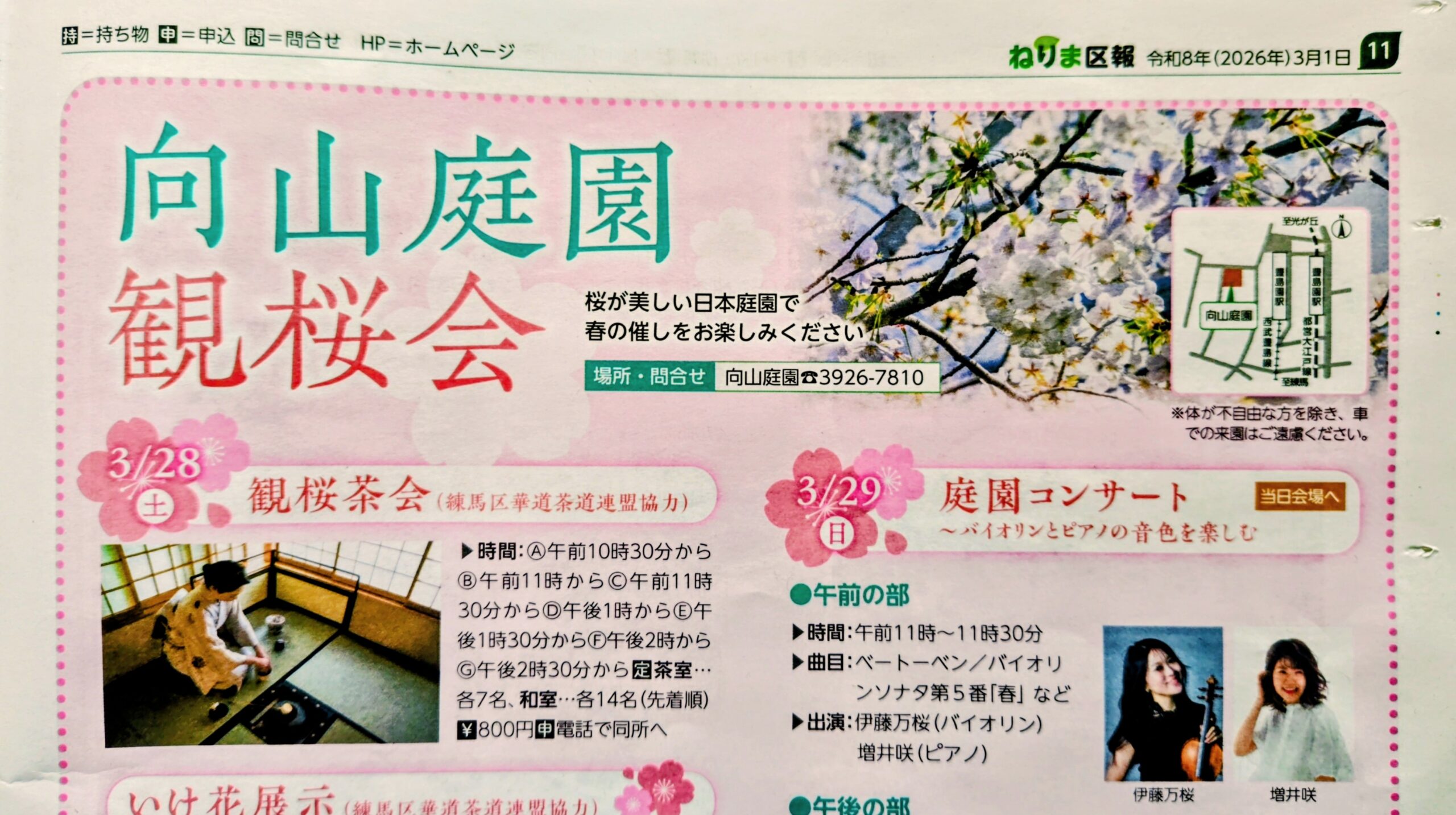 満開の桜に向かって、演奏者も気持ちよく弾かせていただける向山庭園(こうやまていえん)。練馬区の奥座敷と言われるほど手入れの行き届いた庭園は夜にはライトアップもされます。傾斜地を上手に利用した庭園には池や茶室もあり、アゴラ造園様によって大切に護られている素敵な場所です。